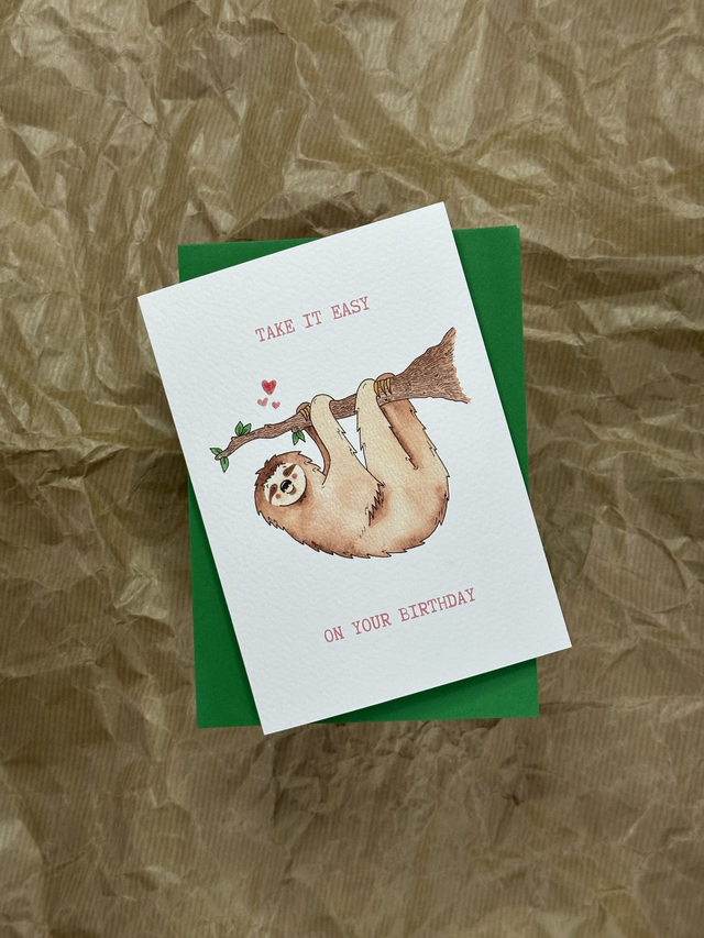 Celebrate birthdays with a charming touch using this adorable "Take It Easy On Your Birthday" greeting card featuring a cute sloth illustration. This card encourages the recipient to unwind and enjoy their special day.